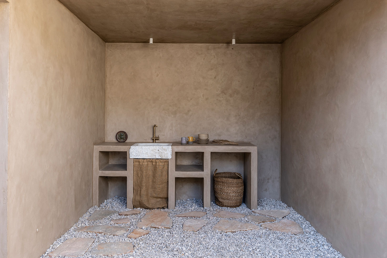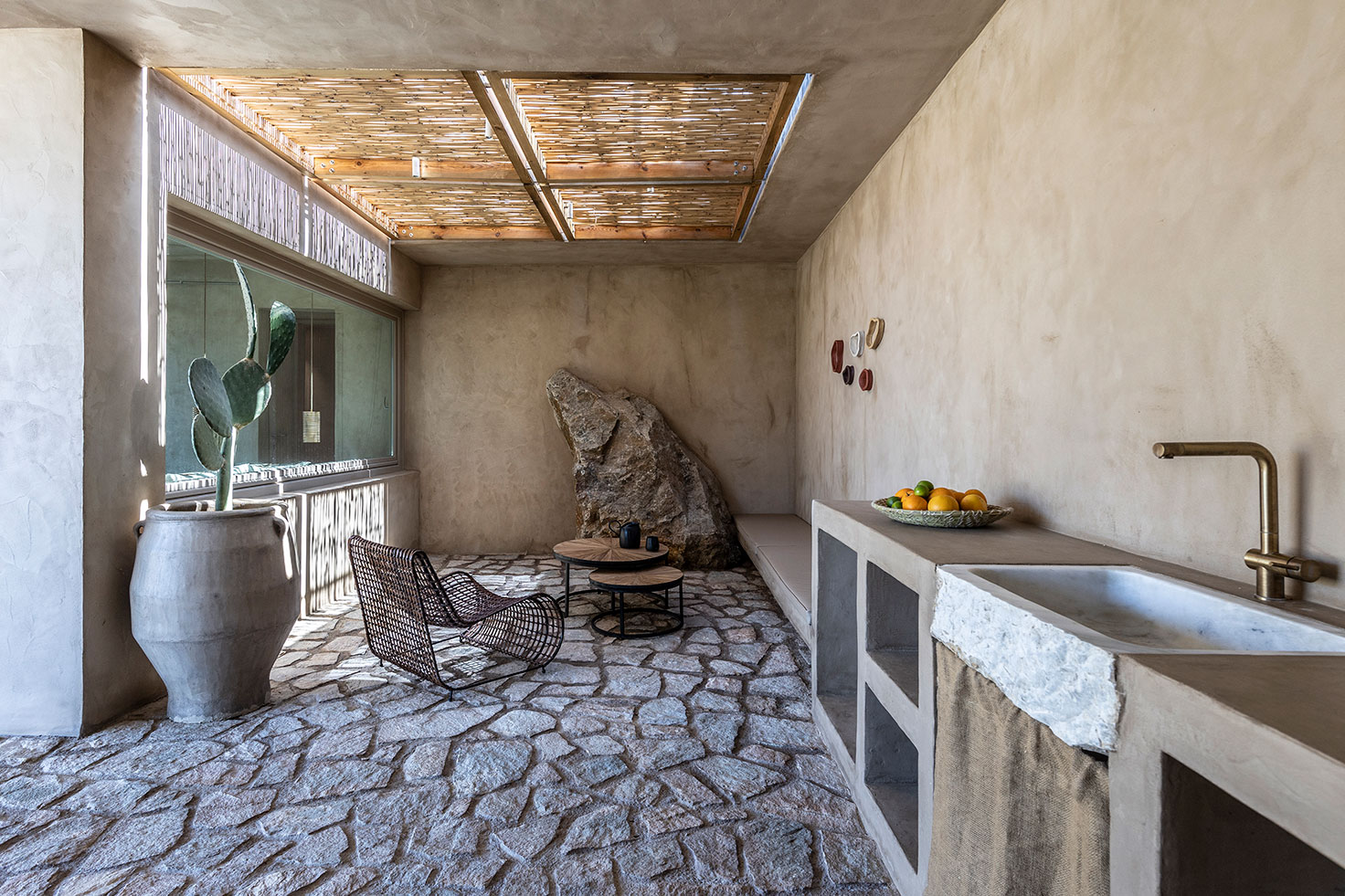 Here the soil is clearly the projection of the house. This becomes more vibrant by the earthy colored stone floor throughout the terrace and its gradual blend with the soil.